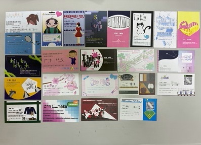 イラストや名前のロゴを作成したものを組み合わせて名刺を制作しました。その後、大学の先生やスタッフの方々も含めて交換会を行いました。